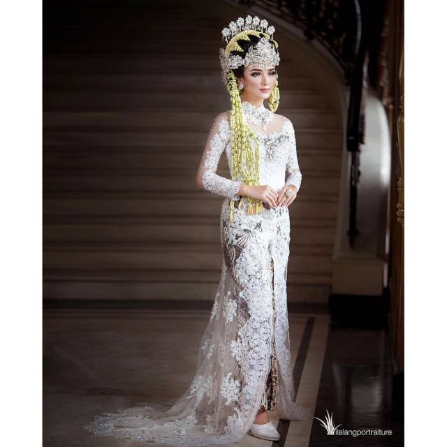 Gaun kebaya pengantin putih ekor/kebaya ijab akad nikah.